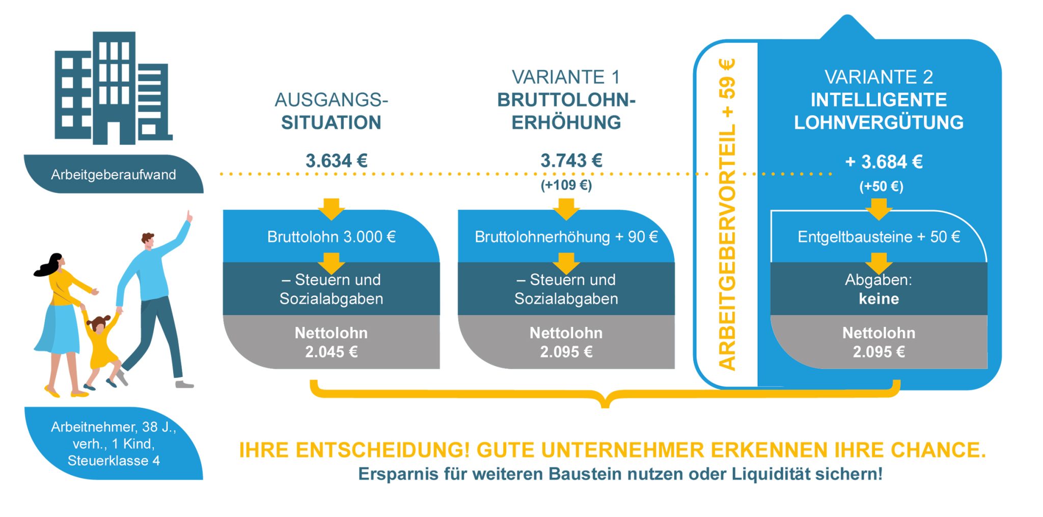 Gemeinsam mit Ihnen entwickeln wir Ihr maßgeschneidertes Vergütungskonzepte aus über 80 steuerbegünstigten Lohnarten, die die Bedürfnisse und Motivationen berücksichtigen. Drei mögliche Bausteine sind beispielsweise: Werkzeuggeld, Zweitwohnung und Aufmerksamkeit.